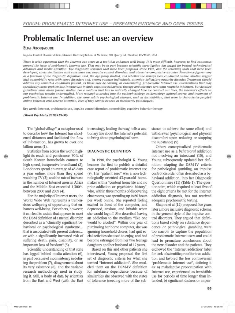 ing the problem (7), disagreement about termed “Internet addiction”. She mod- “problematic Internet use”, defining it