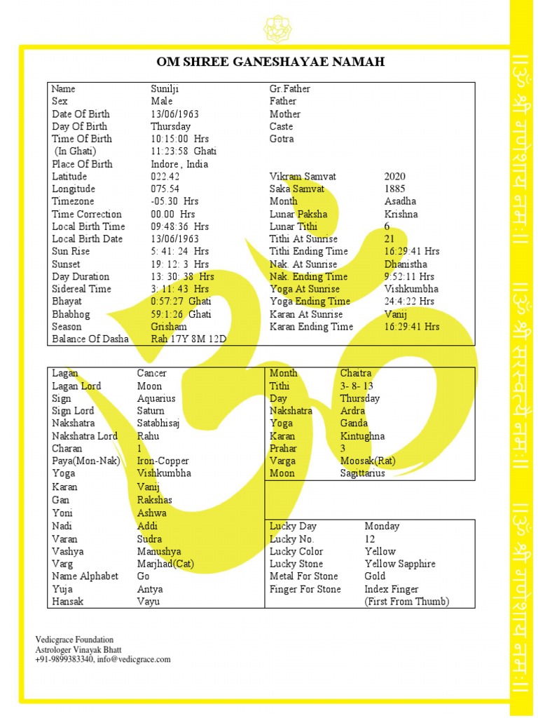 1963 Time of Birth : 10.15 AM Place of Birth: INDORE, Madhya Pradesh Please send me