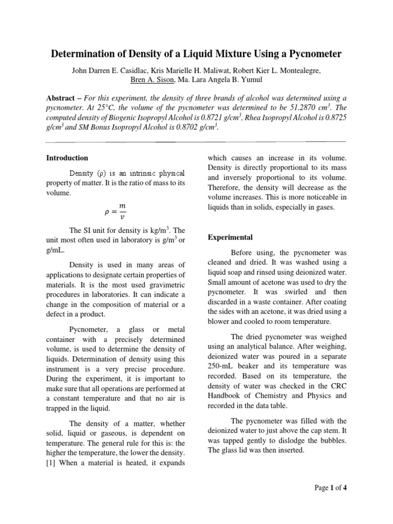 Abstract – For this experiment, the density of three brands of alcohol was determined using a