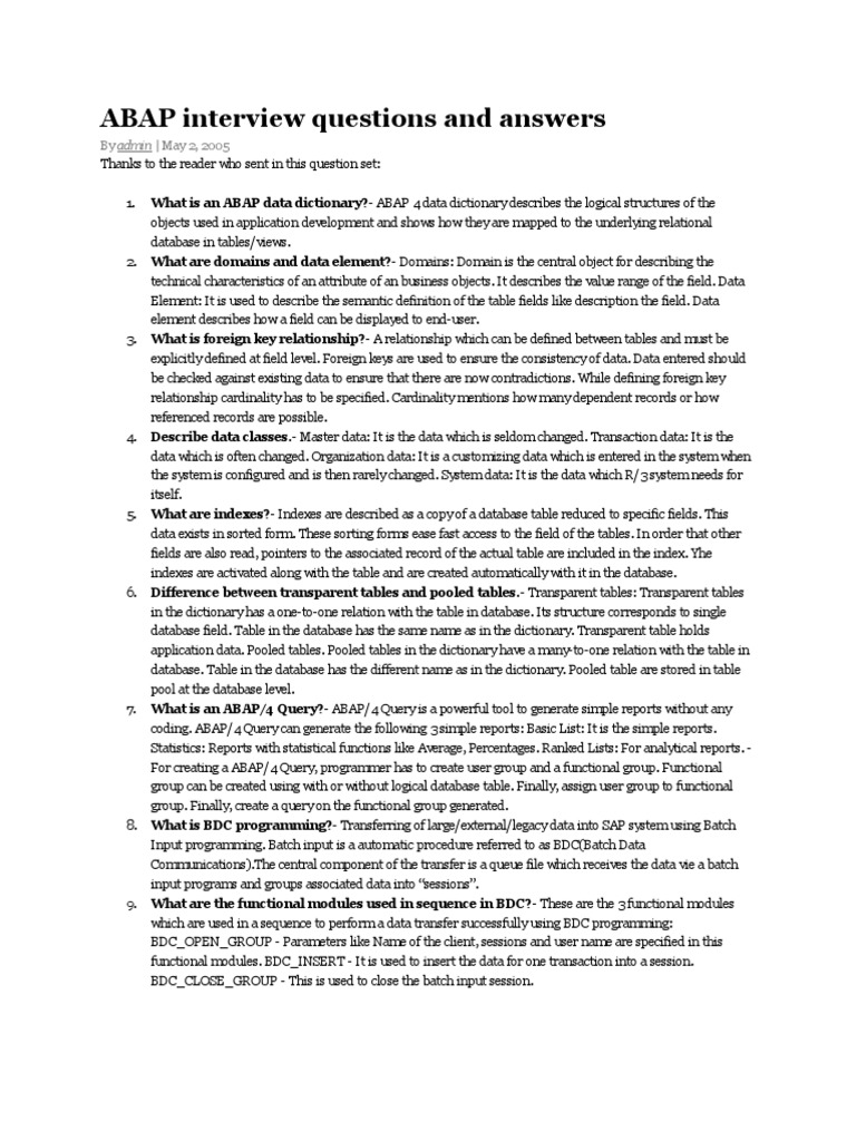 1. What is an ABAP data dictionary?- ABAP 4 data dictionary describes the logical structures of the