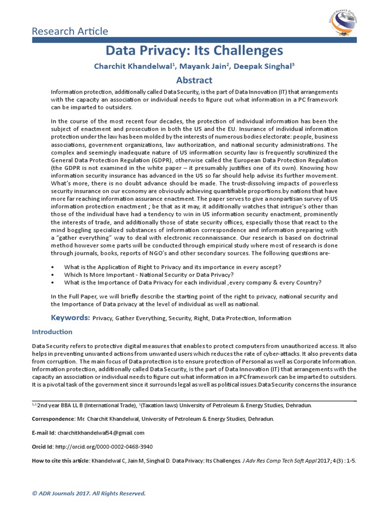 How to cite this article: Khandelwal C, Jain M, Singhal D. Data Privacy: Its Challenges. J Adv Res Comp Tech Soft Appl 2017; 4(3) : 1-5.