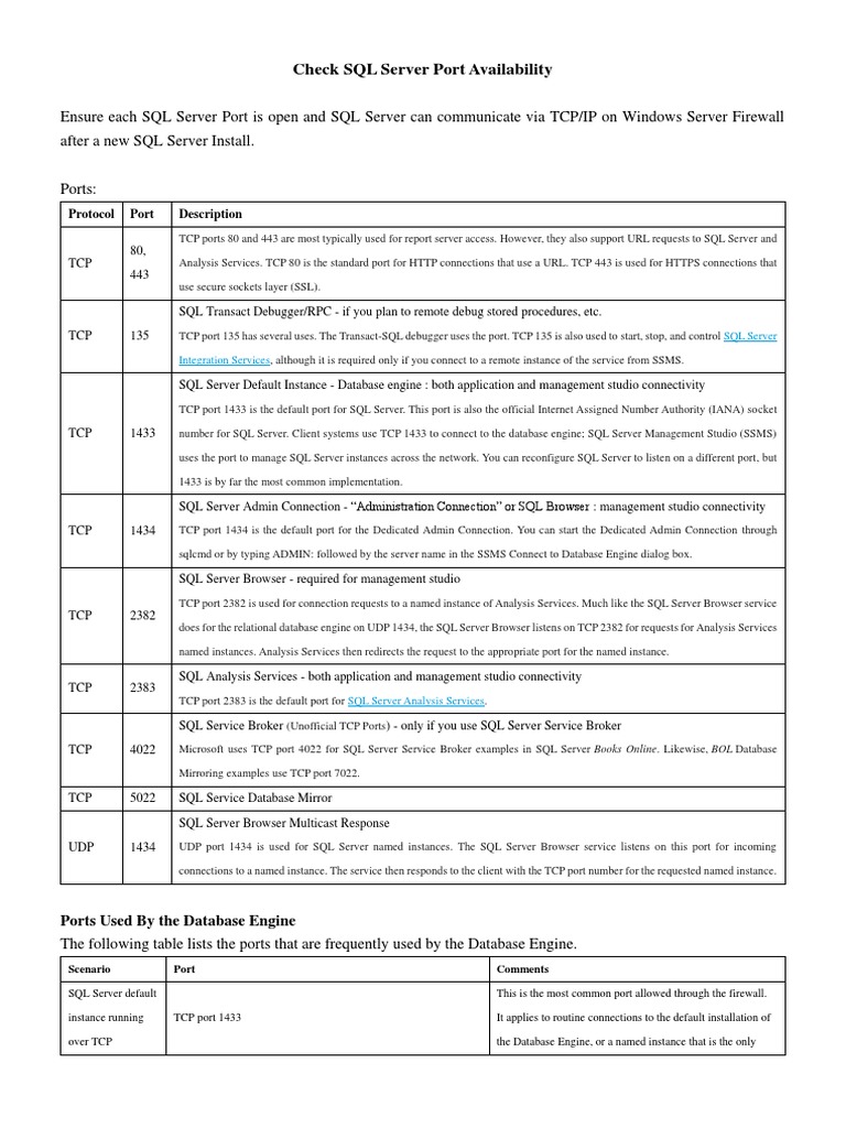TCP port 1433 is the default port for SQL Server. This port is also the official Internet Assigned Number Authority (IANA) socket