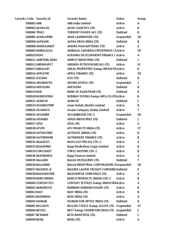 Security Code Security Id Security Name Status Group