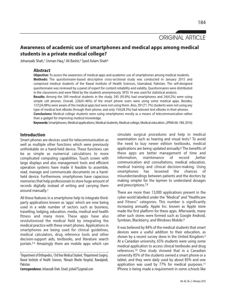 Keywords: Smartphones, Medical applications, Medical students, Medical college, Medical education. (JPMA 66: 184; 2016)