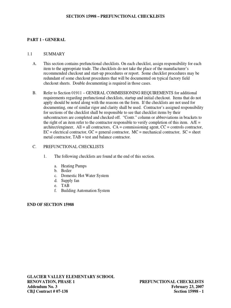 SECTION 15998 – PREFUNCTIONAL CHECKLISTS