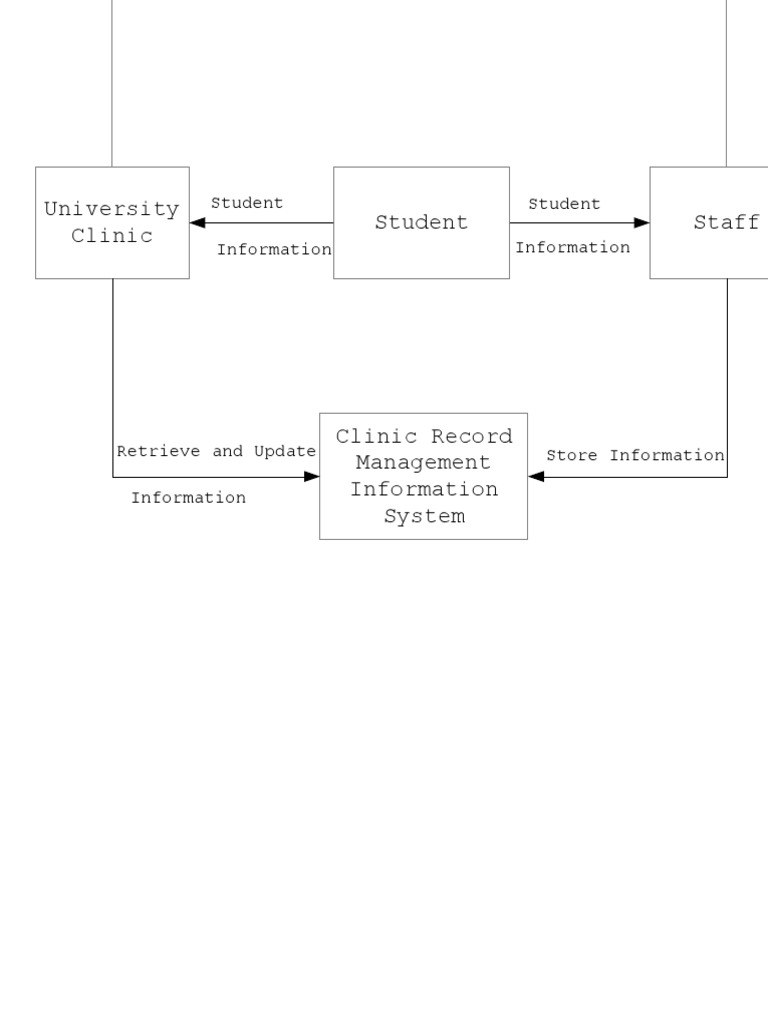 The document outlines a university clinic's information system. The clinic collects information from students and staff. It uses an information management system to store, retrieve, and update clinic records and information. The system helps the clinic manage patient information.