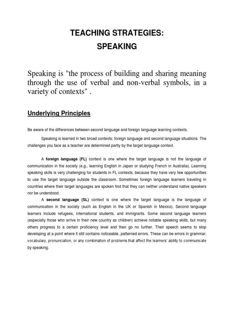Speaking is learned in two broad contexts: foreign language and second language situations. The