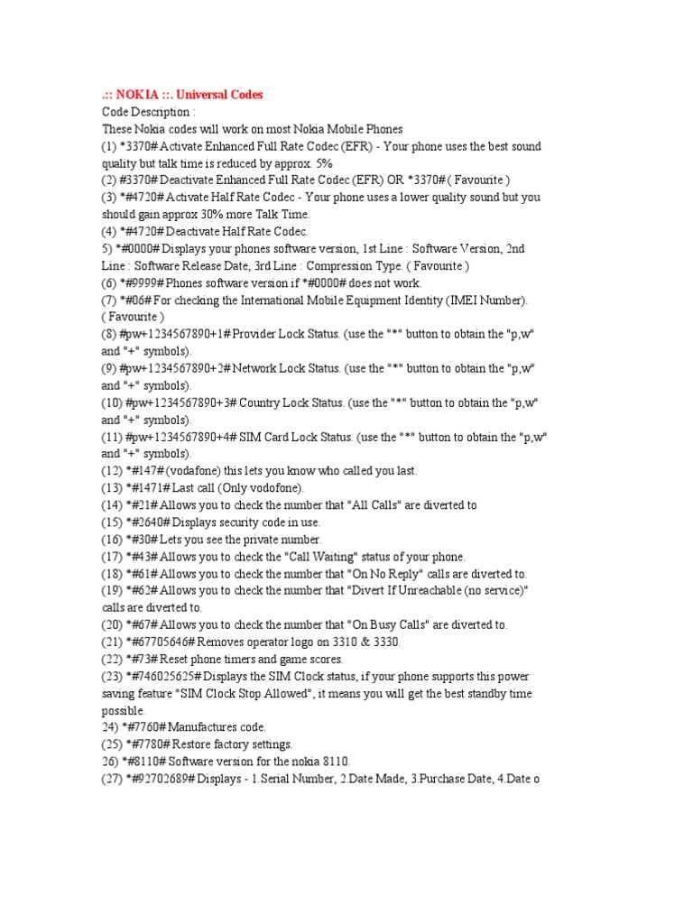 These Nokia codes will work on most Nokia Mobile Phones