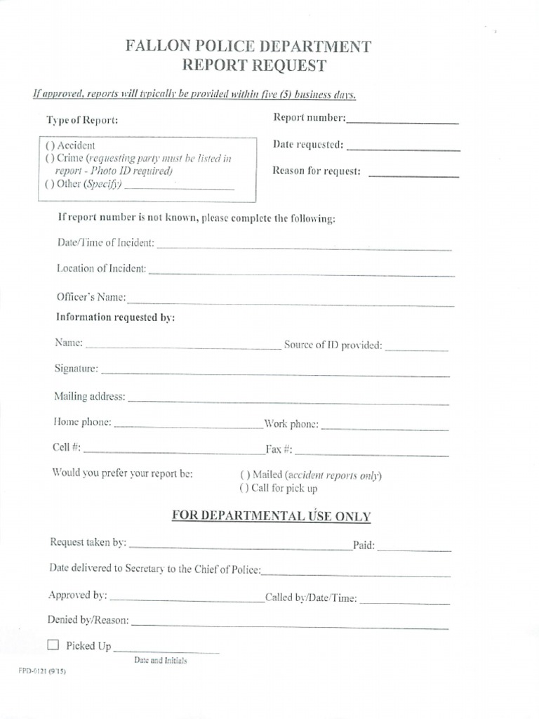 Requests for police records can be male from 8:30 a.m. to 4:30 p. at the Fallon Police Department