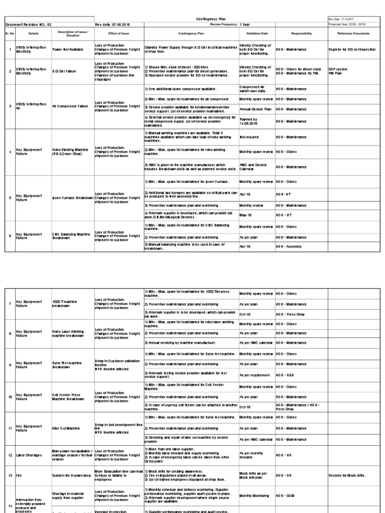 Sr. No. Details Effect of Issue Contingency Plan Validation Date Responsibility Reference Documents