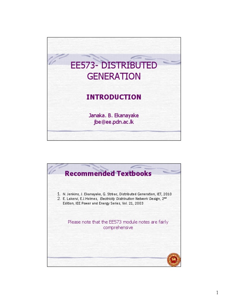 1. N. Jenkins, J. Ekanayake, G. Strbac, Distributed Generation, IET, 2010