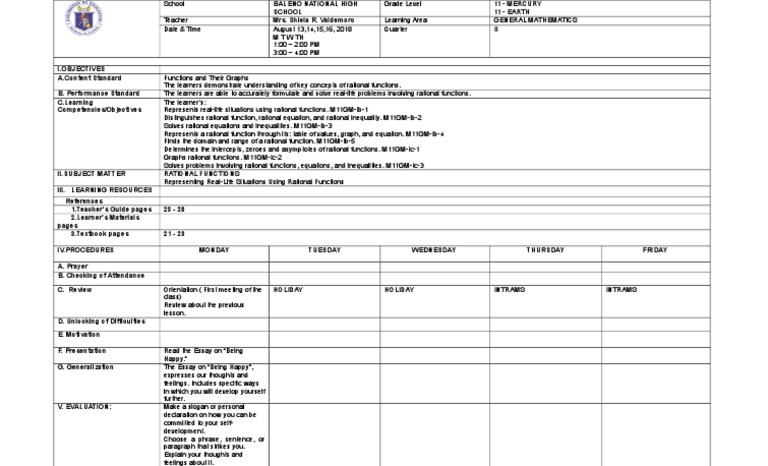Teacher Mrs. Shiela R. Valdemoro Learning Area GENERAL MATHEMATICS