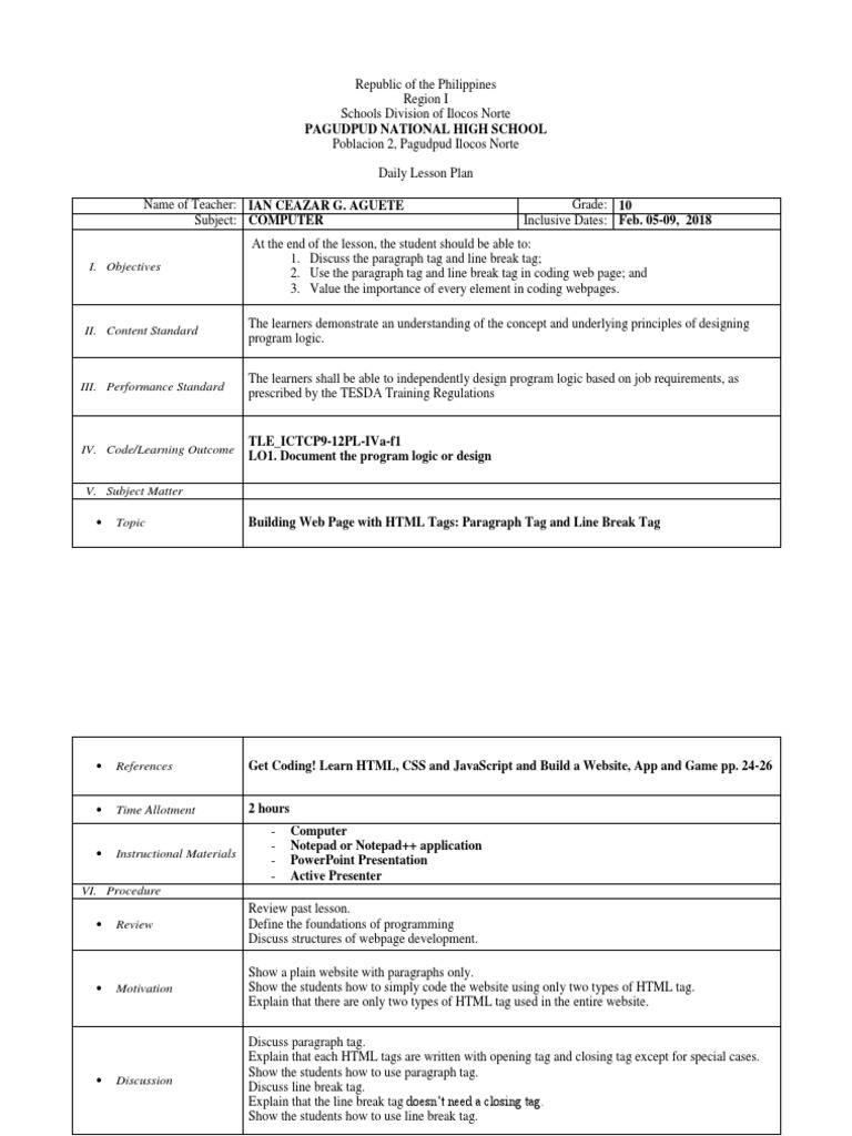 Name of Teacher: IAN CEAZAR G. AGUETE Grade: 10