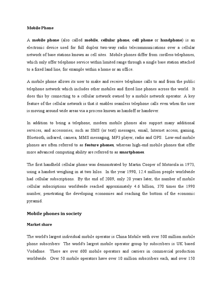 A mobile phone (also called mobile, cellular phone, cell phone or handphone) is an