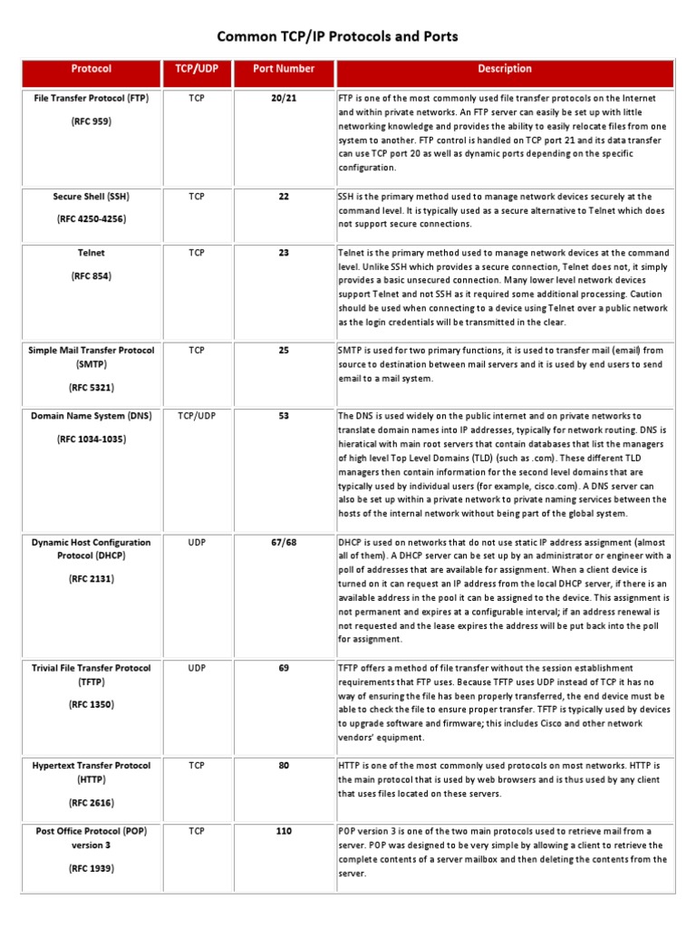 Secure Shell (SSH) TCP 22 SSH is the primary method used to manage network devices securely at the