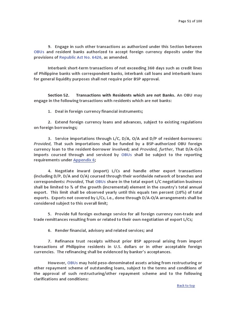 Section 52. Transactions with Residents which are not Banks. An OBU may
