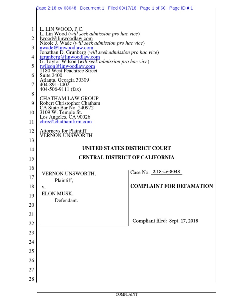 1 COMES NOW Plaintiff, Vernon Unsworth, and files his Complaint for