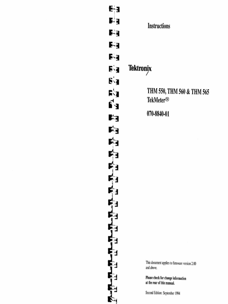 Instructions THM 550, THM 560 & THM 565 TekMeter® 070-8840-01 a a al 1 a the rear ofthis manual, ead Second Edition: September 1994 ,Copyright © Tektronix, Inc. 1993, 1994, All rights reserved, Licensed software ort WARRANTY products are owned by Tektronix or its suppliers and are protected by United States copyright laws and international treaty provisions. tials and set forth in subparagraph (c)(1)(i) of the Rights in Technical Data and 7 tchange forthe defective product. Gon Sofrare cise n DIARS 252227013 crsupangrpsoxt) SD ME : and 2) ofthe Commercial Computer Software ~ Restricted Rights clause at BESy__ neotenic ner hi wary Custer ma pai Tk of edt FAR 52.227-19, as applicable. he before the expiration of the warranty period and make suitable arrangements forthe Wig ne eather tn server comer dsigntea by Tlironn wth shipping charges ‘Tektronix products are covered by U.S. and foreign patents, issued and pending. Information in this publication supercedes that in all previously published material. Specifications and price change privileges reserved. Printed in the U.S.A. “This waranty shall not apply to any defect, failure or damage caused by improper use or improper or inadequate maintenance and care. Tektronix shall not be obligated to furnish service under this warranty ) to repair damage resulting from attempts by personnel other than Tektronix representatives to install, repair or service the product; b) to repair damage resulting from improper use or connection to incompatible equipment; or c) (0 service a ___preuct that has been modified or integrated with otber products when the effect of such =¥ modification or integration increases the time or difficulty of servicing the product. “Tektronis, Inc., PO. Box 1000, Wilsonville, OR 97070-1000 ‘TEKTRONIX and TEK are registered trademarks of Tektronix, Inc ‘TekMeter is a registered trademark of Tektronia, Ine.