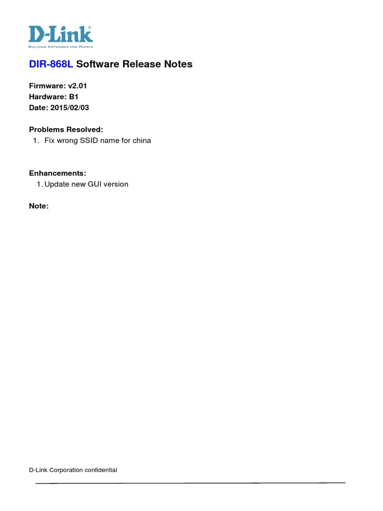 This firmware update for the DIR-868L fixes an issue where the wireless network name was displaying incorrectly for Chinese users. It also updates the graphical user interface to a new version. No other changes or notes were included in the release.