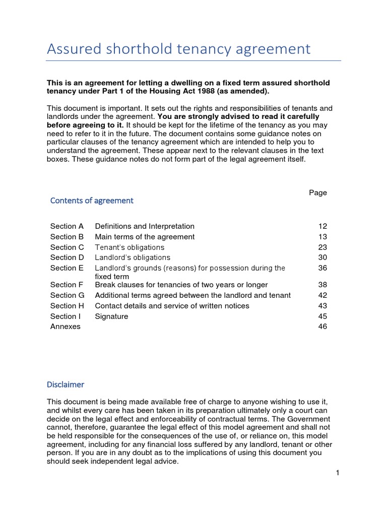1.1 This is an agreement for a fixed term assured shorthold tenancy: