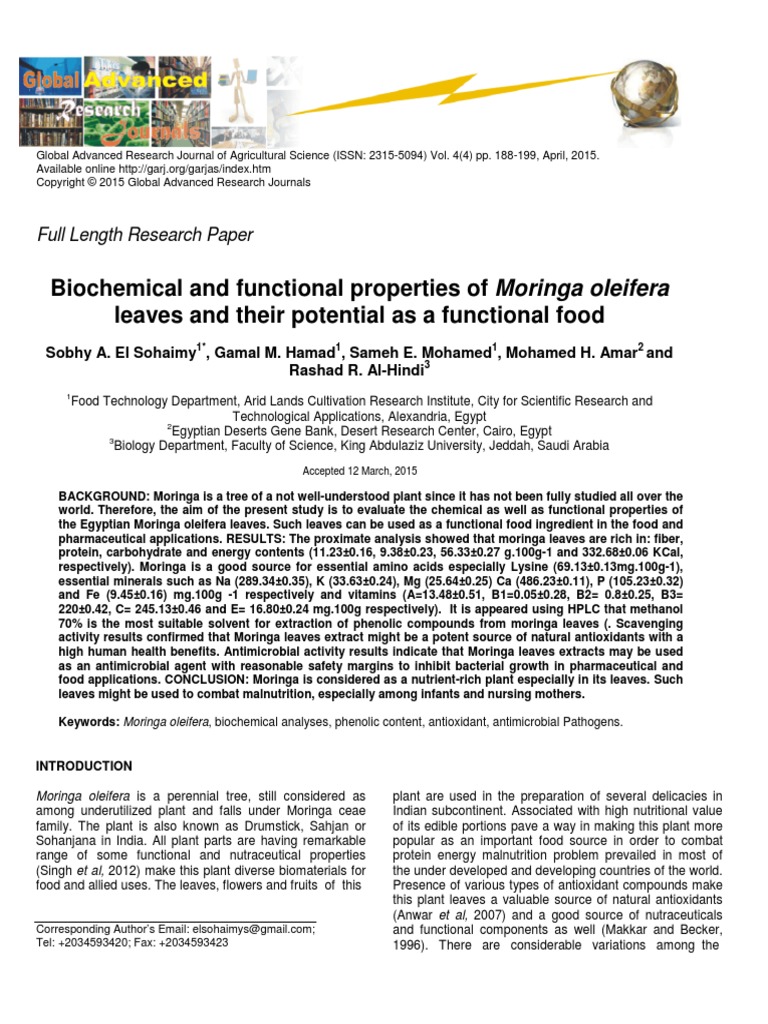 the Egyptian Moringa oleifera leaves. Such leaves can be used as a functional food ingredient in the food and