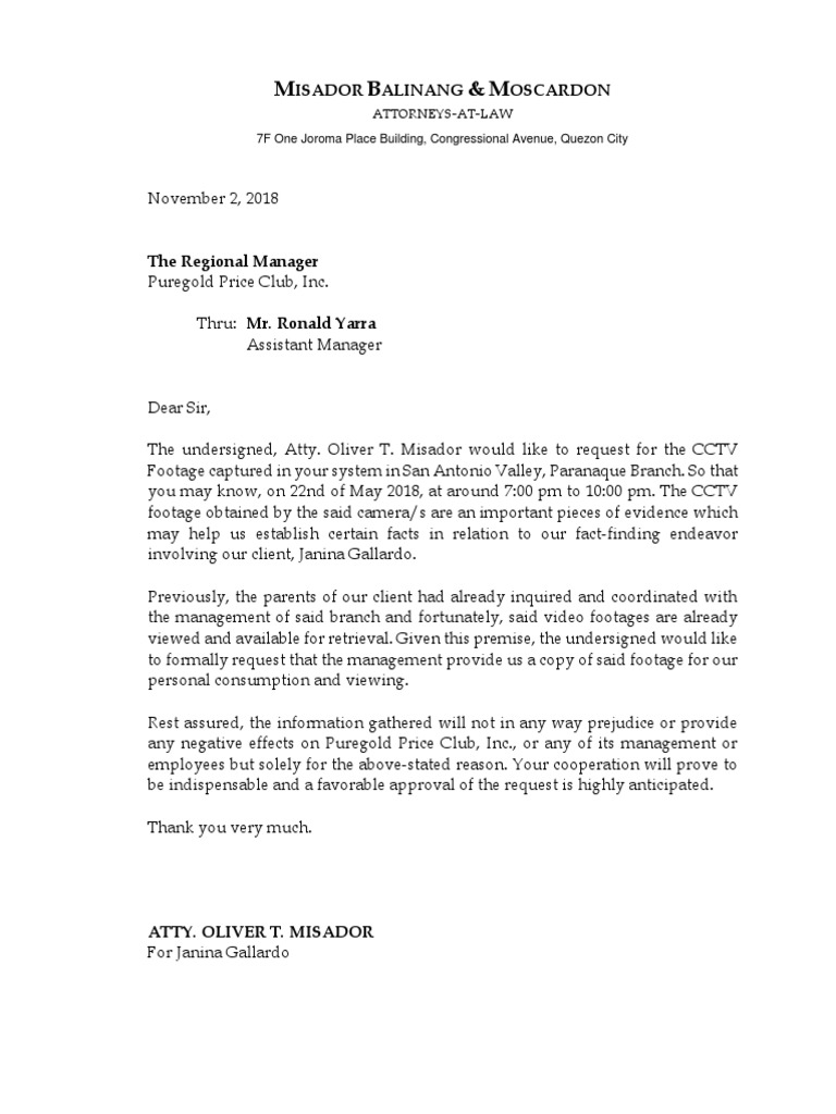 The undersigned, Atty. Oliver T. Misador would like to request for the CCTV