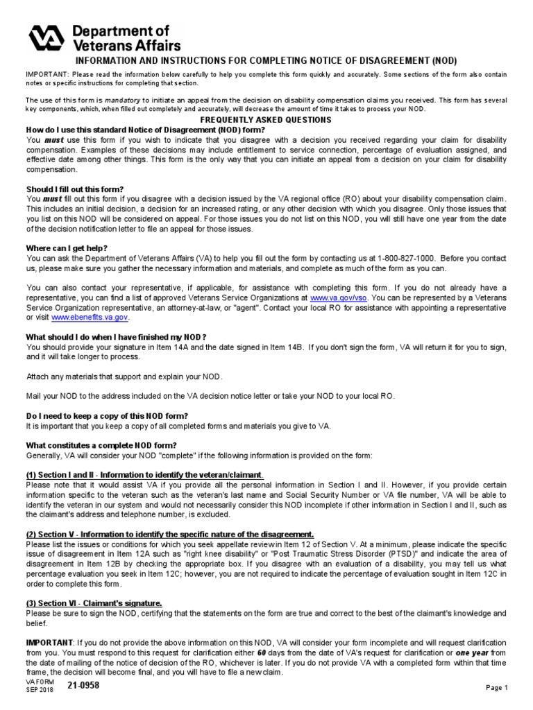 Generally, VA will consider your NOD "complete" if the following information is provided on the form: