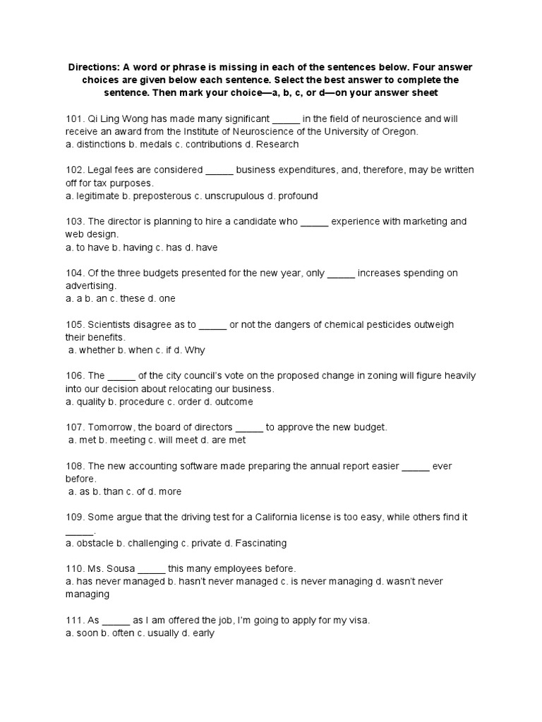 choices are given below each sentence. Select the best answer to complete the