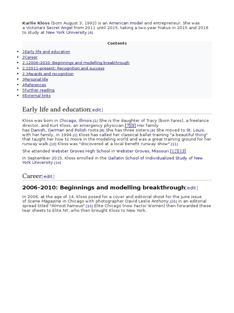 runway walk.[10] Kloss was "discovered at a local benefit runway show".[11]