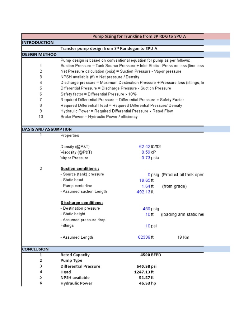 Pump Sizing for Trunkline from SP RDG to SPU A