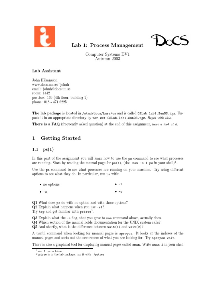 The lab package is located in /stud/docs/kurs/os and is called OSLab.lab1.SunOS.tgz. Un-