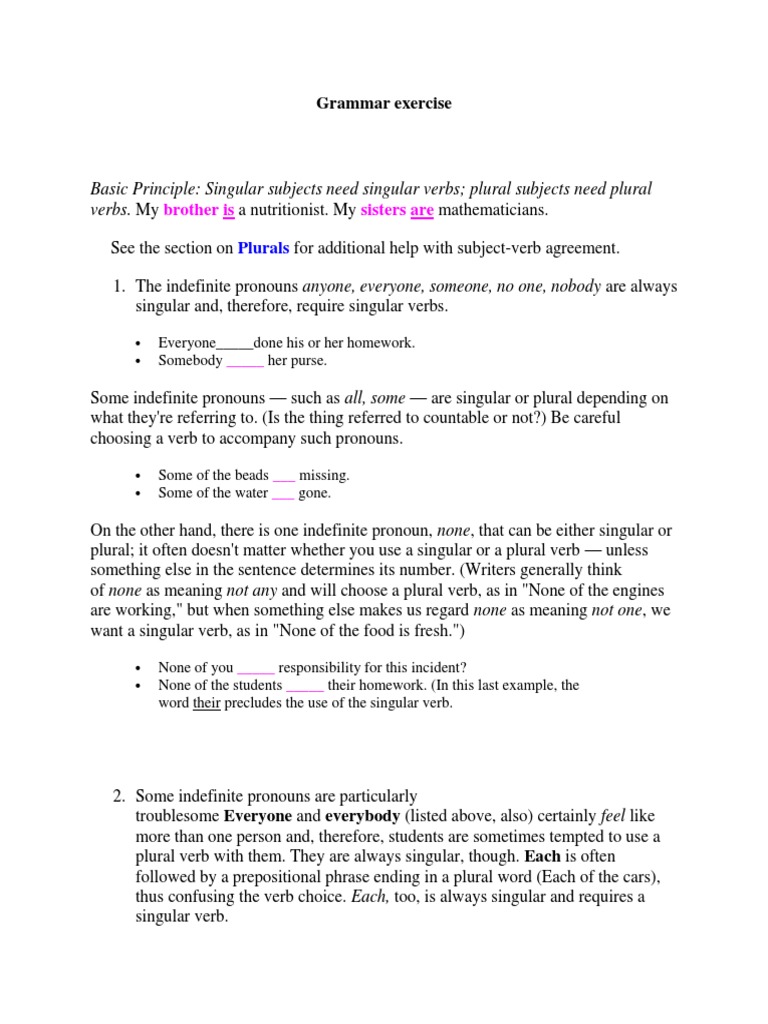 Basic Principle: Singular subjects need singular verbs; plural subjects need plural