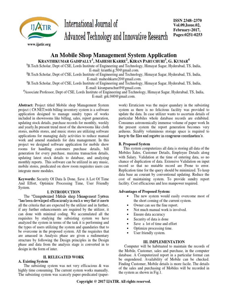 Abstract: Project titled Mobile shop Management System work) Erraticism was the major quandary in the subsisting