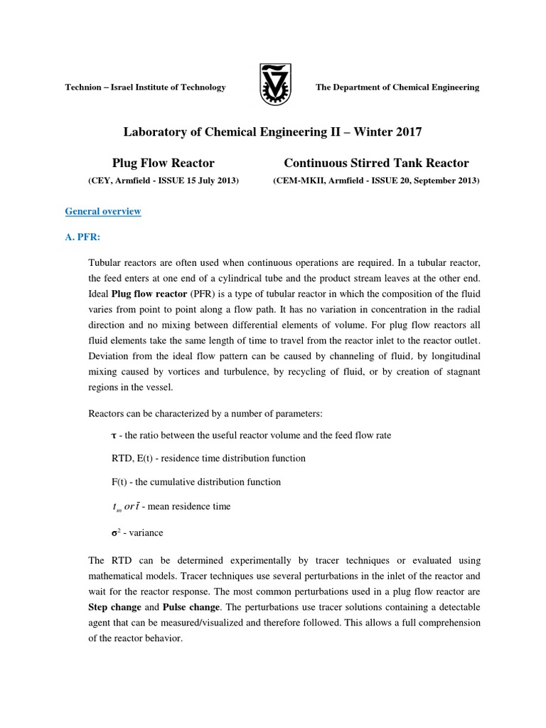 Make sure you understand the following prior to the lab: CSTR, PFR, , E (t ) , F (t ) , tm , 2 ,