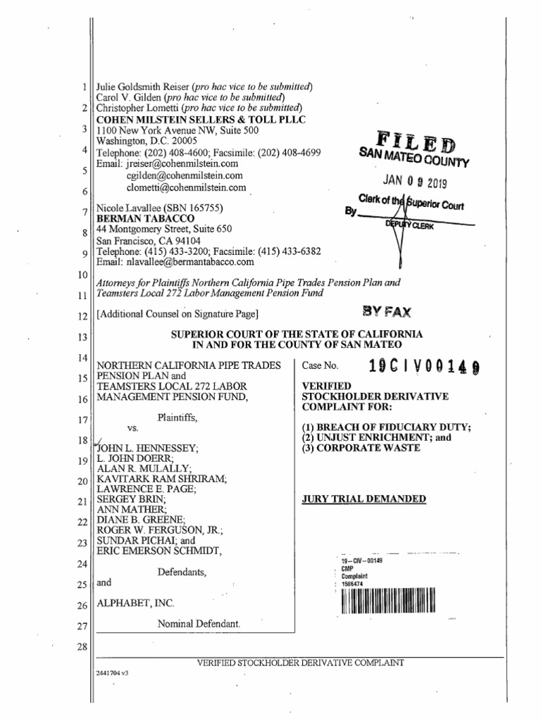 15 561299 (Cal. Sup. Ct. San Francisco Cty.); Wicks v. Alphabet, Ina, No. 3:18-cv-6245 (N.Dj Cal.);