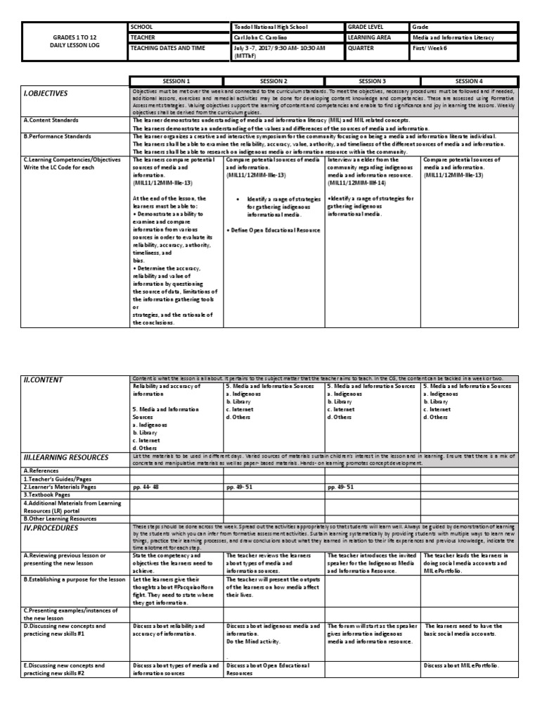 GRADES 1 TO 12 TEACHER Carl John C. Carolino LEARNING AREA Media and Information Literacy
