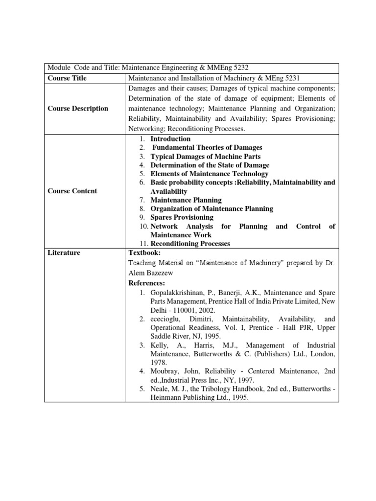 Course Description maintenance technology; Maintenance Planning and Organization;