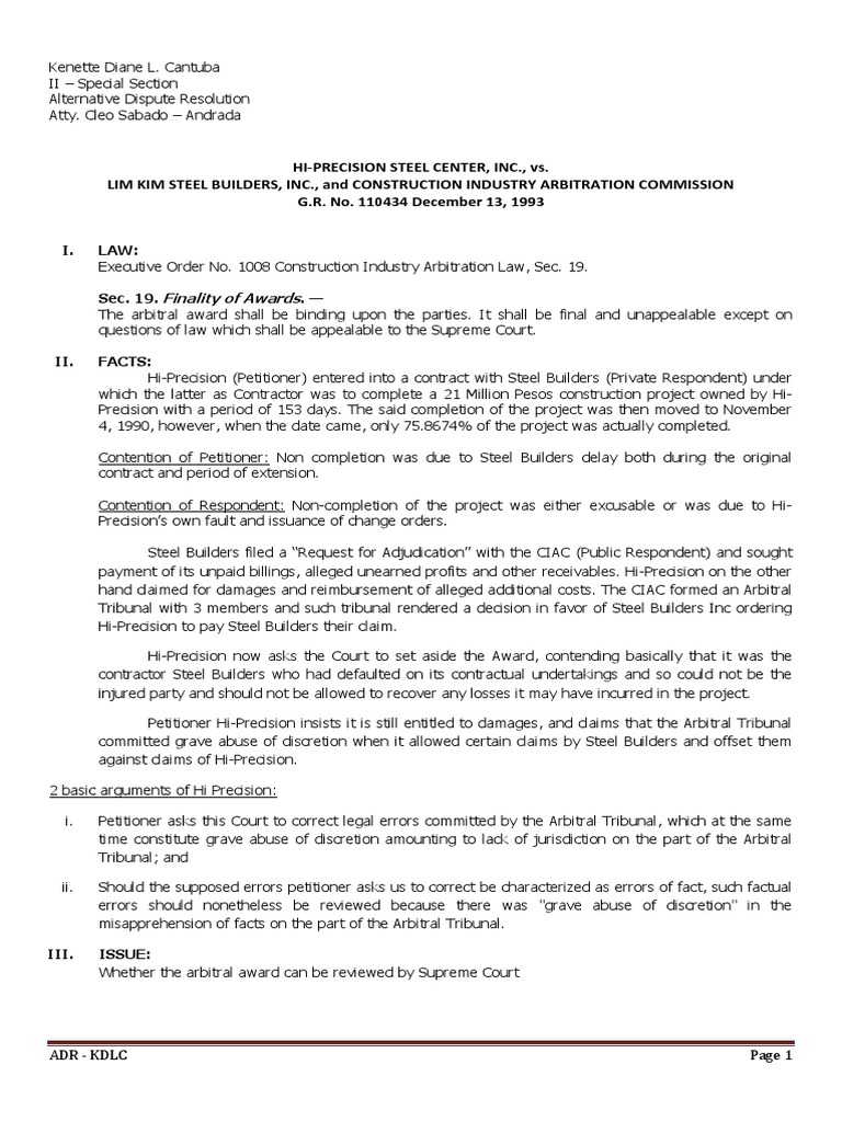 Hi-Precision (Petitioner) entered into a contract with Steel Builders (Private Respondent) under