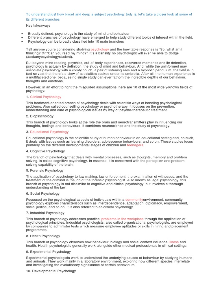Psychology can be broadly classified into 10 main branches