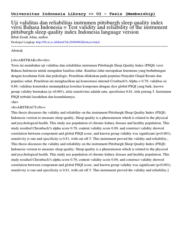 Tesis ini membahas uji validitas dan reliabilitas instrumen Pittsburgh Sleep Quality Index (PSQI) versi