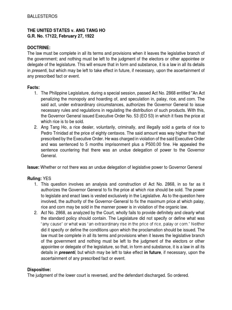 2. Ang Tang Ho, a rice dealer, voluntarily, criminally, and illegally sold a ganta of rice to