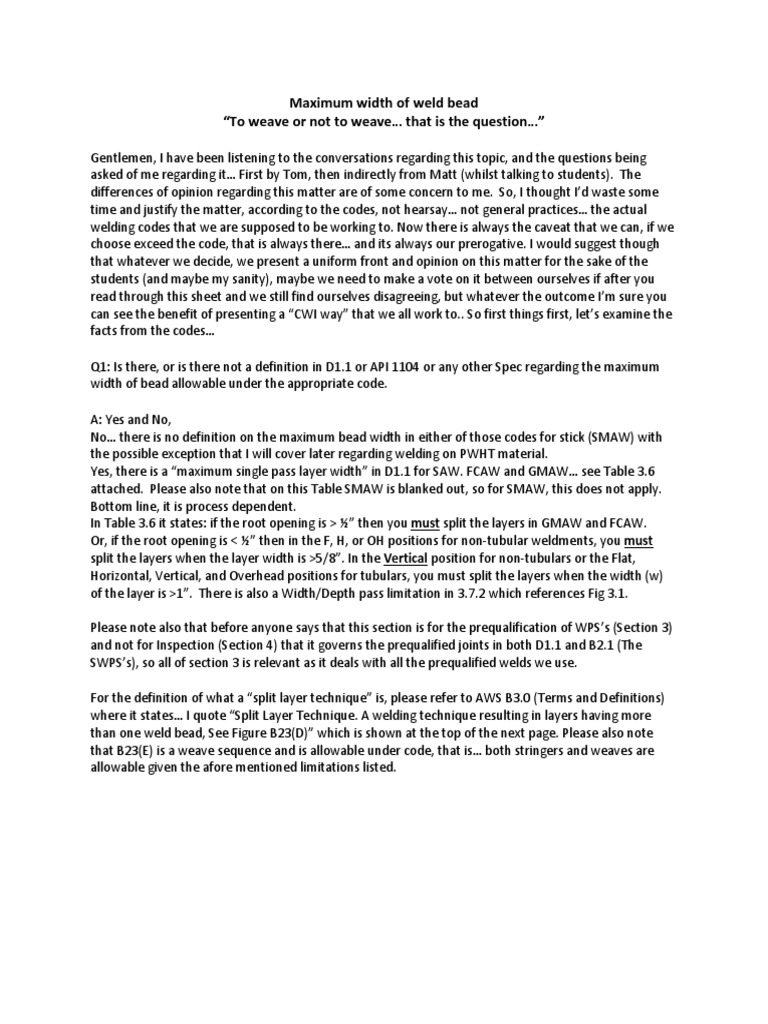 Q1: Is there, or is there not a definition in D1.1 or API 1104 or any other Spec regarding the maximum