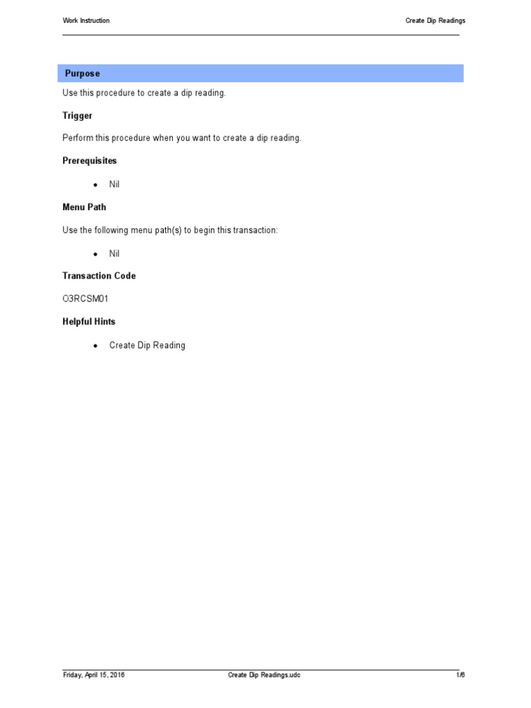 Work Instruction Create Dip Readings