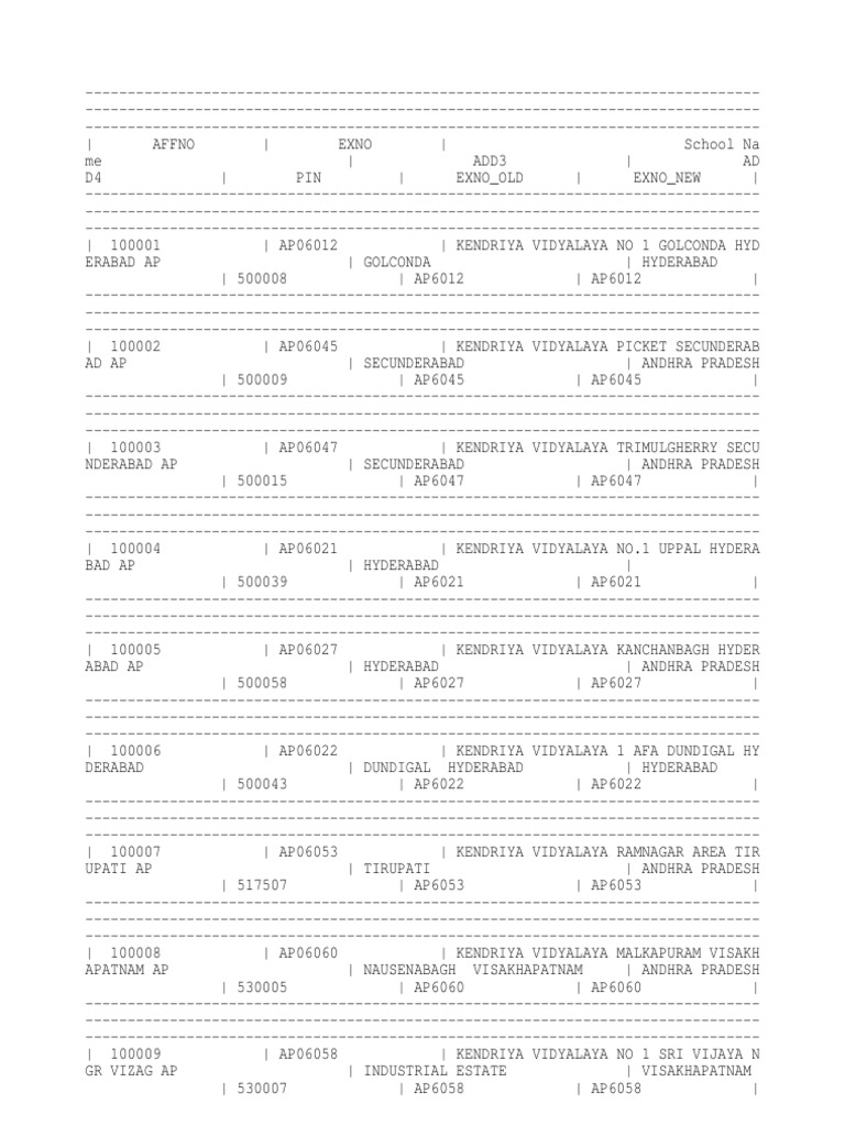 | 100001 | AP06012 | KENDRIYA VIDYALAYA NO 1 GOLCONDA HYD