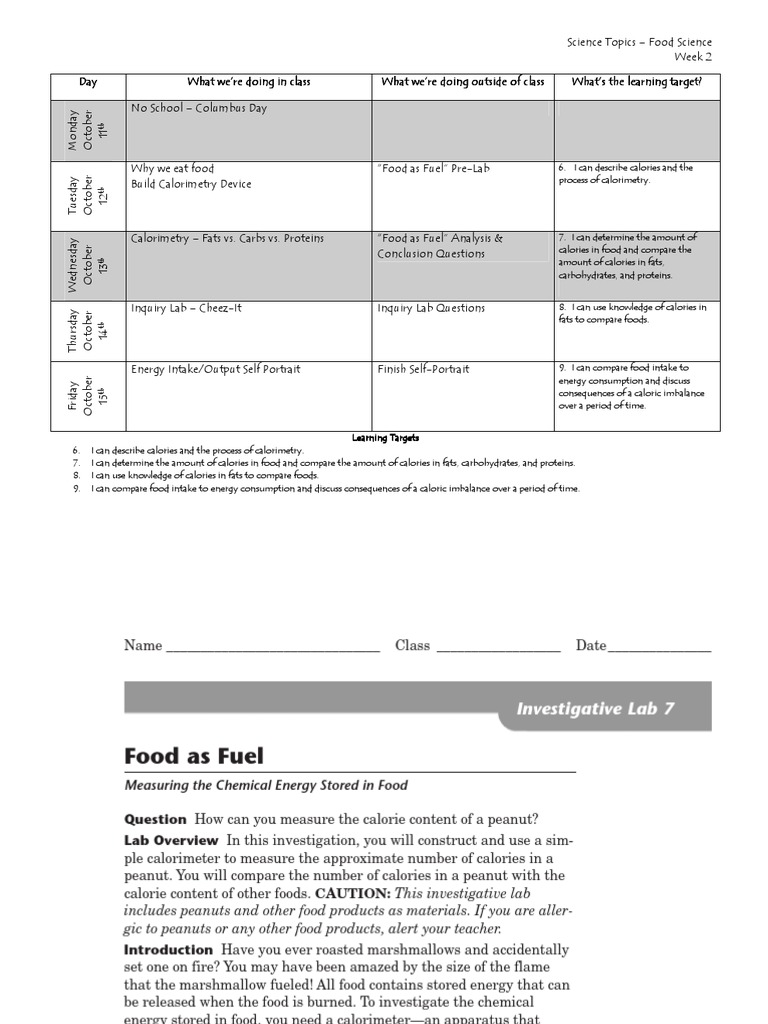Calorimetry – Fats vs. Carbs vs. Proteins “Food as Fuel” Analysis & 7. I can determine the amount of