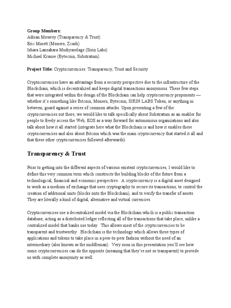 Project Title: Cryptocurrencies: Transparency, Trust and Security