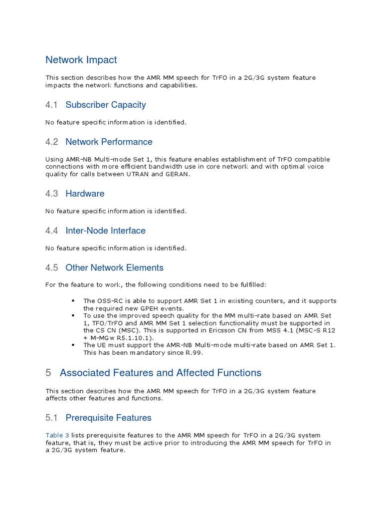 Table 3 lists prerequisite features to the AMR MM speech for TrFO in a 2G/3G system