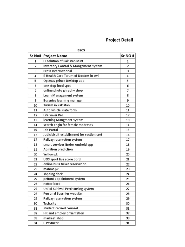 Sr No# Project Name Sr NO #