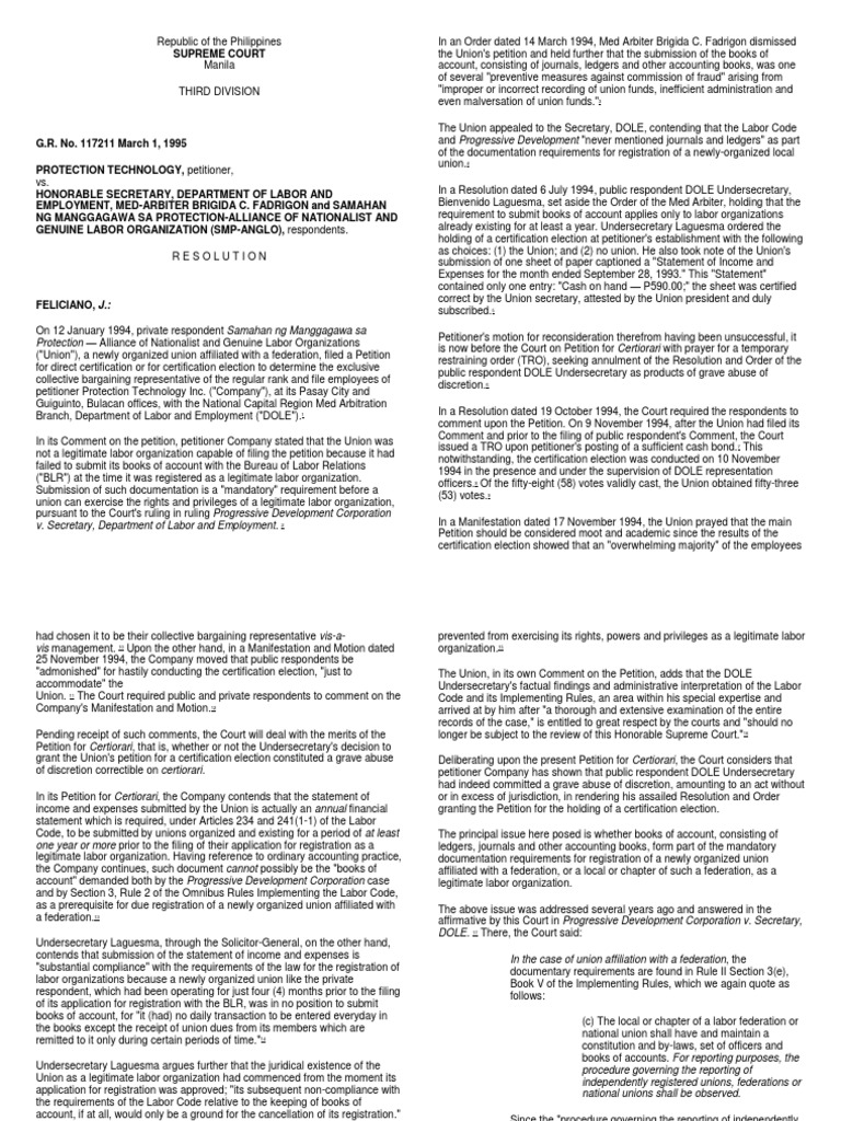 v. Secretary, Department of Labor and Employment. 2 In a Manifestation dated 17 November 1994, the Union prayed that the main