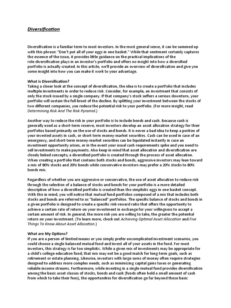 role diversification plays in an investor's portfolio and offers no insight into how a diversified